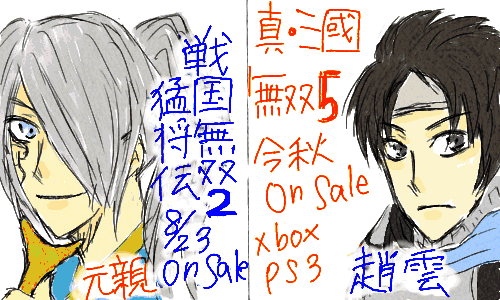 そして!!まさかの三國無双5!!公式サイトいったら、趙雲とか呂布とかキャラの髪型とか格好とか一新してました!!多分全員変わるんだろうな。それも楽しみだけど、趙雲が川泳いでたり、櫓登ってたりしてる画像があったので、ステージ攻略も一新されてるみたい。出るのがPS3だから、ほんとに新しい三國無双の世界が楽しめそうです☆